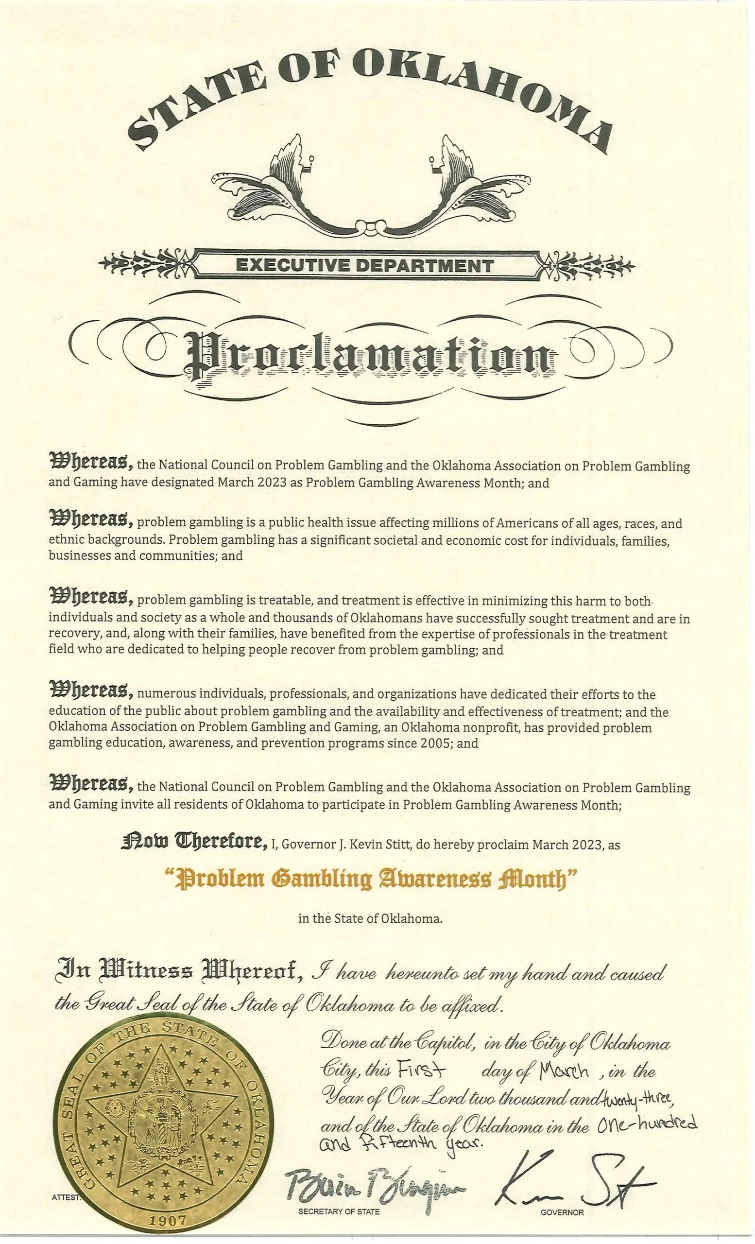 WHEREAS, the National Council on Problem Gambling and the Oklahoma Association on Problem Gambling and Gaming have designated March 2023 as Problem Gambling Awareness Month;